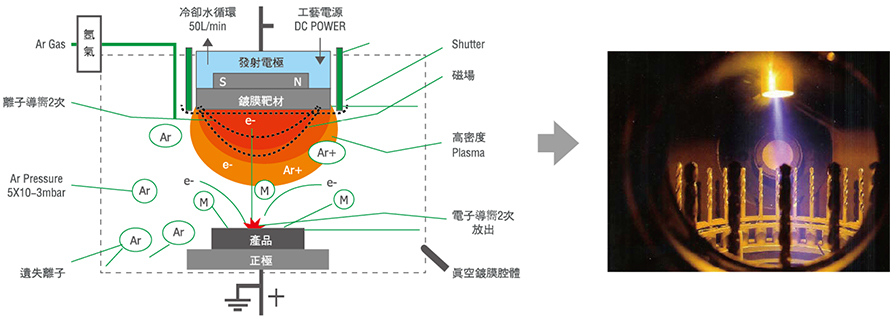 In a suitable vacuum environment, connect the high-voltage power supply to establish a low-pressure gas discharge low-temperature plasma zone between the evaporation source and the substrate. The substrate electrode is connected to a DC negative high voltage to form a glow discharge cathode, and the plating material vaporizes atoms. Entering this area collides with inert gas ions and electrons, and the ionized ions and gas ions bombard the surface of the coating with higher energy, depositing the evaporate or its reactants on the laminate.
