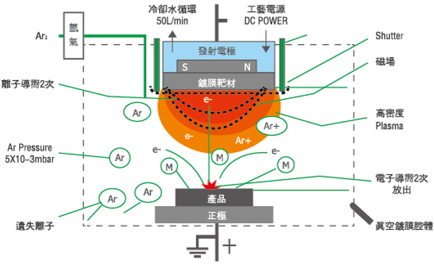 When a certain amount of gas (such as argon) is charged in a suitable vacuum environment and a 60 kilowatt DC power supply is used, a high voltage of several hundred volts will be generated to generate an arc. In the arc environment, ions and electrons conflict with the target to produce coating Effect.