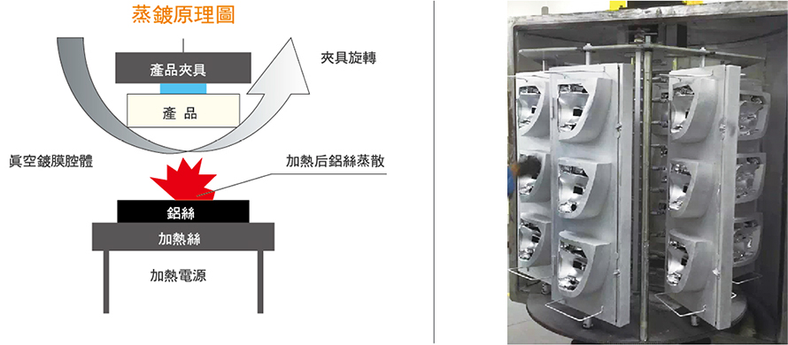 Left: Apply a certain voltage to the heating wire in a suitable vacuum environment to evaporate the aluminum wire placed on the heating wire to the surface of the rotating product to achieve the purpose of aluminum plating.